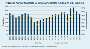 - Economic conditions, rather than generational attitudes, drive worker turnover. Quit rates rise during strong economies and fall during recessions, as seen during the 2008 Great Recession and the 2020 pandemic. (See Figure 2 below)